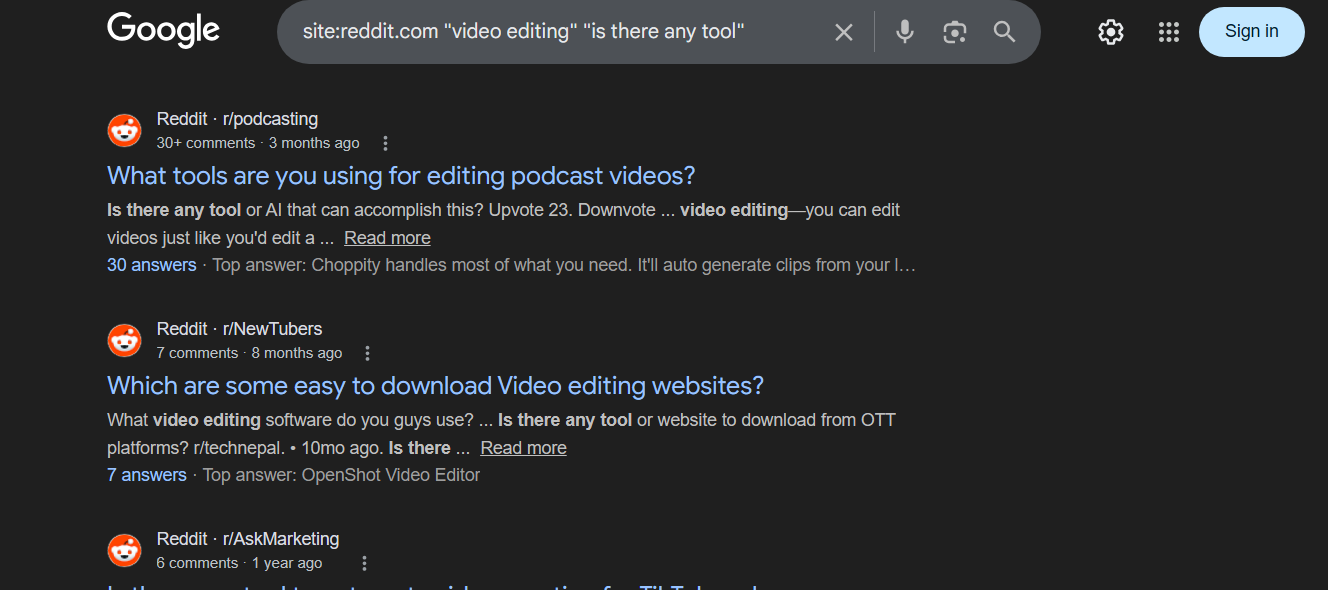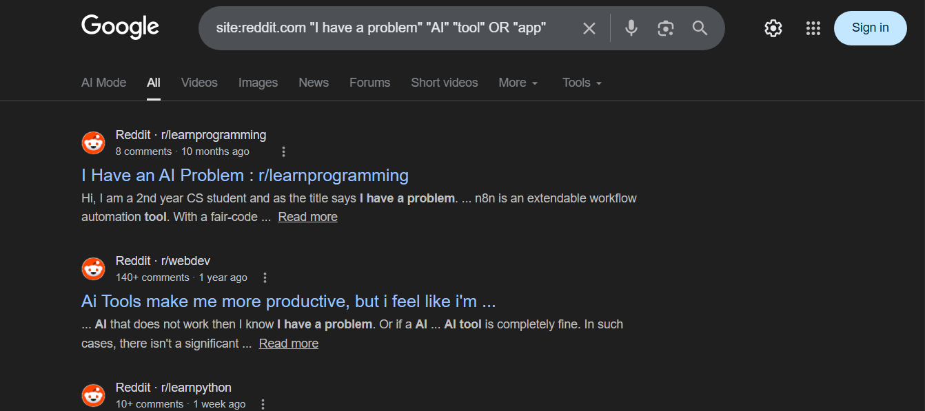 لكن ليس بالطريقة العادية — بل بصيغة بحث ذكية داخل Google: site:reddit.com "ai" "is there any tool"