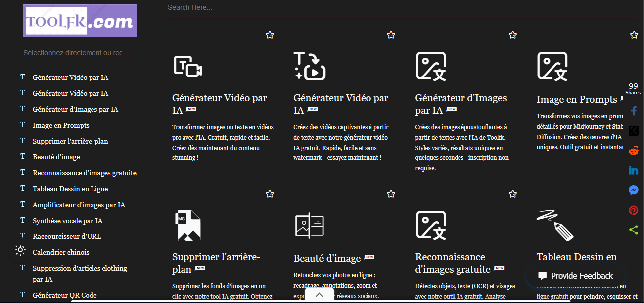 Que vous ayez besoin d’un outil IA pour générer des images, d’un outil de programmation pour protéger votre code, ou d’un outil de design pour supprimer l’arrière-plan d’une photo, ToolFK vous offre tout cela au même endroit.